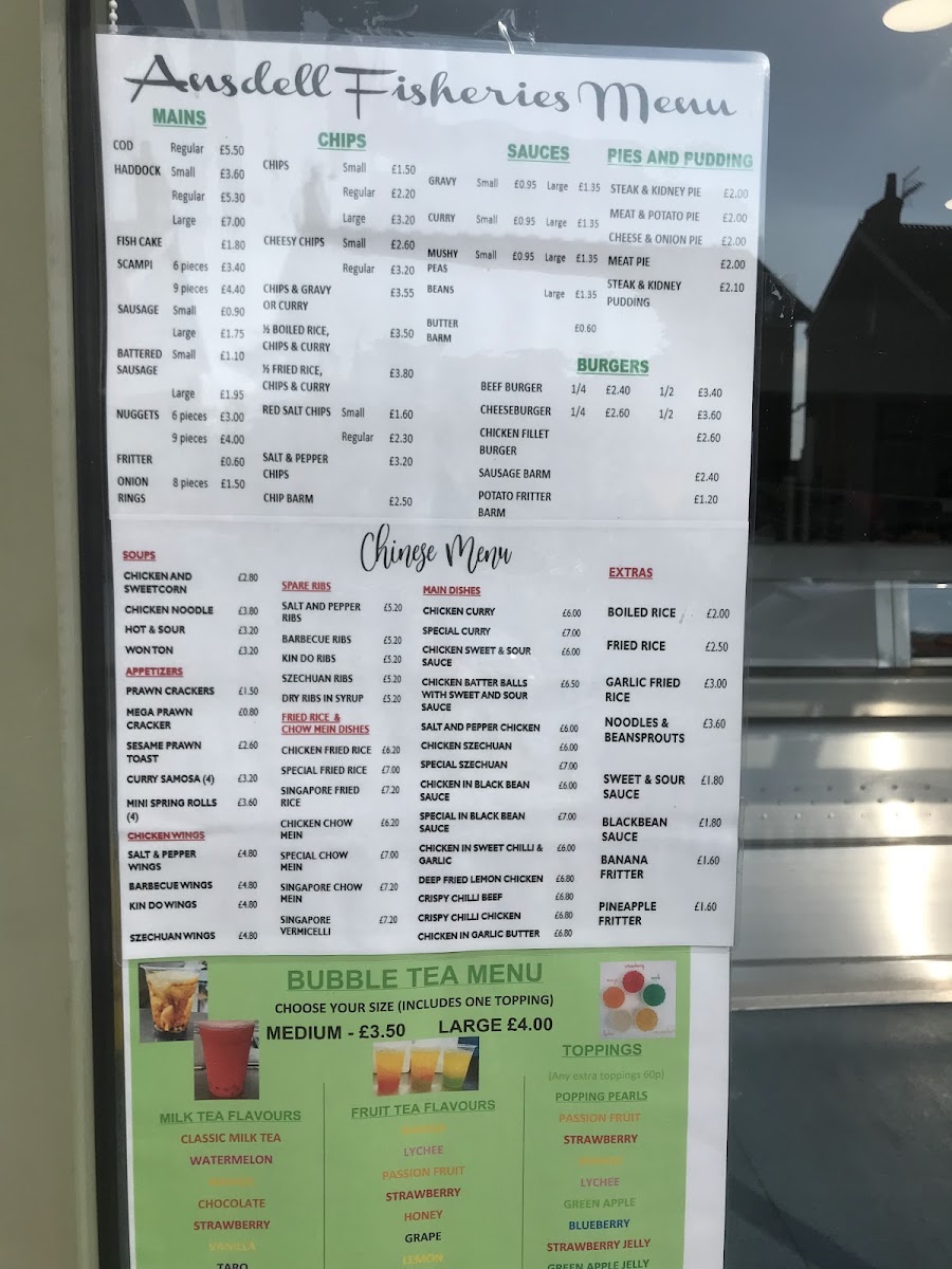 Overall, the menu at Ansdell Fisheries offers a satisfying mix of classic British chip shop staples and Chinese takeaway favorites, making it versatile for different tastes. The hearty selection of pies, including Steak & Kidney Pie, Meat & Potato Pie, and Cheese & Onion Pie, delivers comforting, traditional flavors, while lighter starters like Prawn Crackers, Sesame Prawn Toast, and Mini Spring Rolls add a crispy, flavorful beginning. The inclusion of soups such as Chicken & Sweetcorn and Hot & Sour Wonton broadens the appeal, and the main dishes-like Chicken Chow Mein, Special Chow Mein, Singapore Vermicelli, and Barbecue Ribs-provide generous, satisfying portions. Classic fish options such as Cod, Haddock, and Scampi remain highlights, staying true to the shop’s roots. With customizable sides like Garlic Fried Rice, Fried Rice, and Noodles & Beansprouts, alongside sauces like Gravy and Blackbean Sauce, the menu feels both comprehensive and flexible, offering good value and variety for a casual takeaway experience.